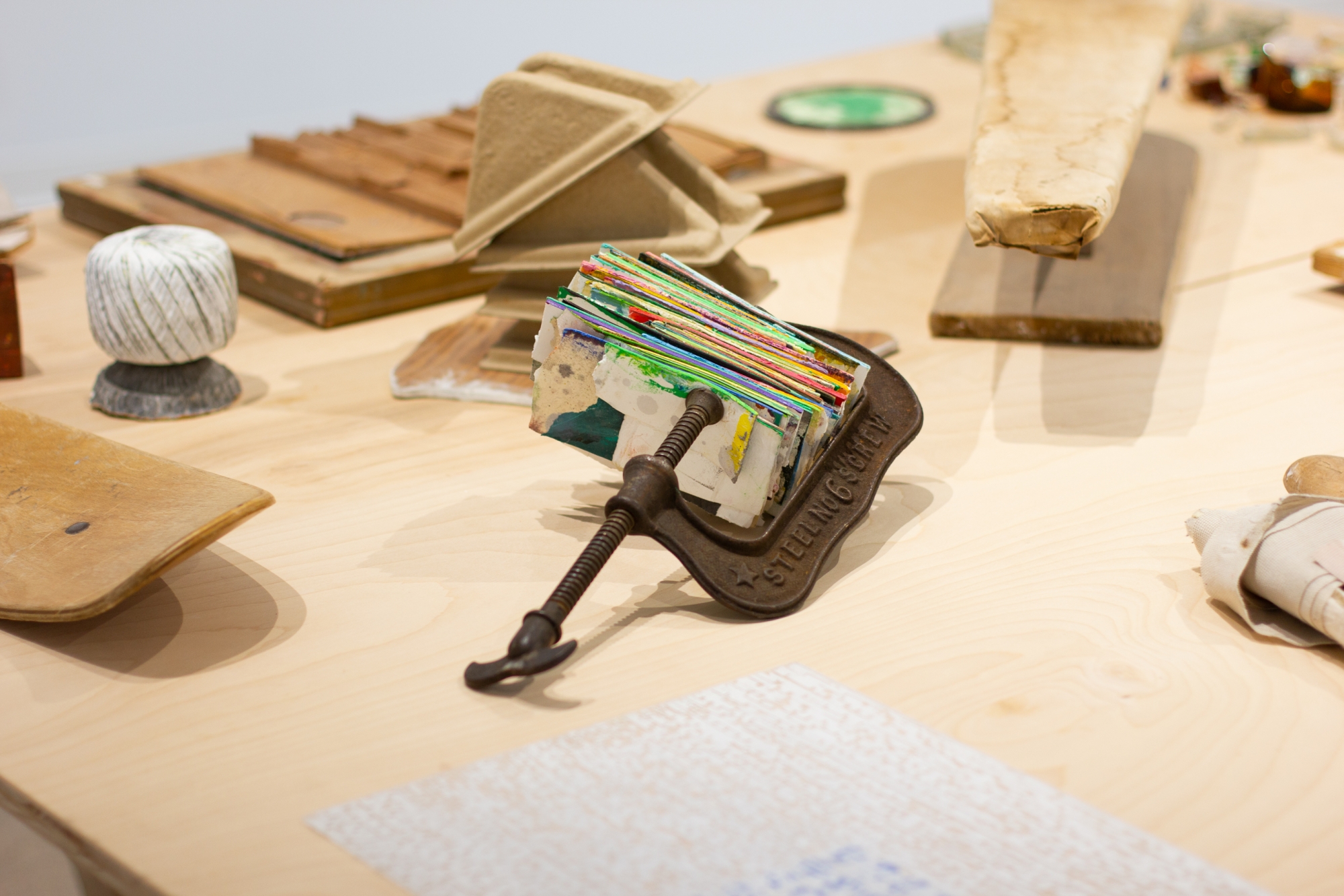 A table sits in the center of the Lux Center for the Arts gallery, covered with pieces of broken glass, the top of a wooden chair, an egg carton covered in plaster, a wooden shoe block and a slab of an old wall.