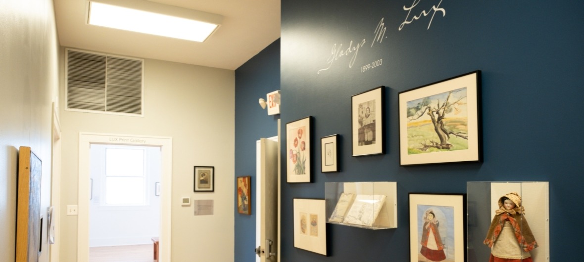 This interpretive display text was written by Susan Soriente, the curator of the Gladys Lux Print Collection and the installation was designed by Haley Shaw, Director of Exhibitions. It was installed on the 2nd floor of the LUX Center for the Arts in September 2022 and unveiled in October. This project was completed during our Gladys Lux retrospective exhibition, honoring the 45th anniversary of the organization she founded.