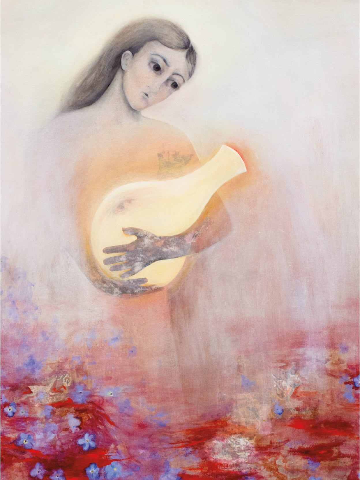 Sargsyan’s body of work incorporates painting, drawing and transfer processes to uncover themes of distance, memory and fragility while celebrating Armenian identity through confrontationally hopeful and reflective outlooks. The Armenian genocide of 1915 fragmented culture and created distance between Armenians and their lands. This fragile quality emerges in her work through the transfer process as it scars elements with tears, holes and rips. With over a century having passed since these horrors, no more witnesses are among us. Only echoes and whispers remain to shape the Armenian collective memory. Thus, her work is guided by a soft color palette and ghostly figures to reference the remnants of these quiet memories.