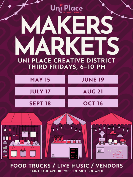 Join us on the third Friday of each month for Uni Place's first night market! May through October, 6 to 10 pm, beat the heat as the district fills with local vendors, live music, food trucks, and community under the lights. Check out the Facebook event, respond, and get ready. We're back and better than ever!