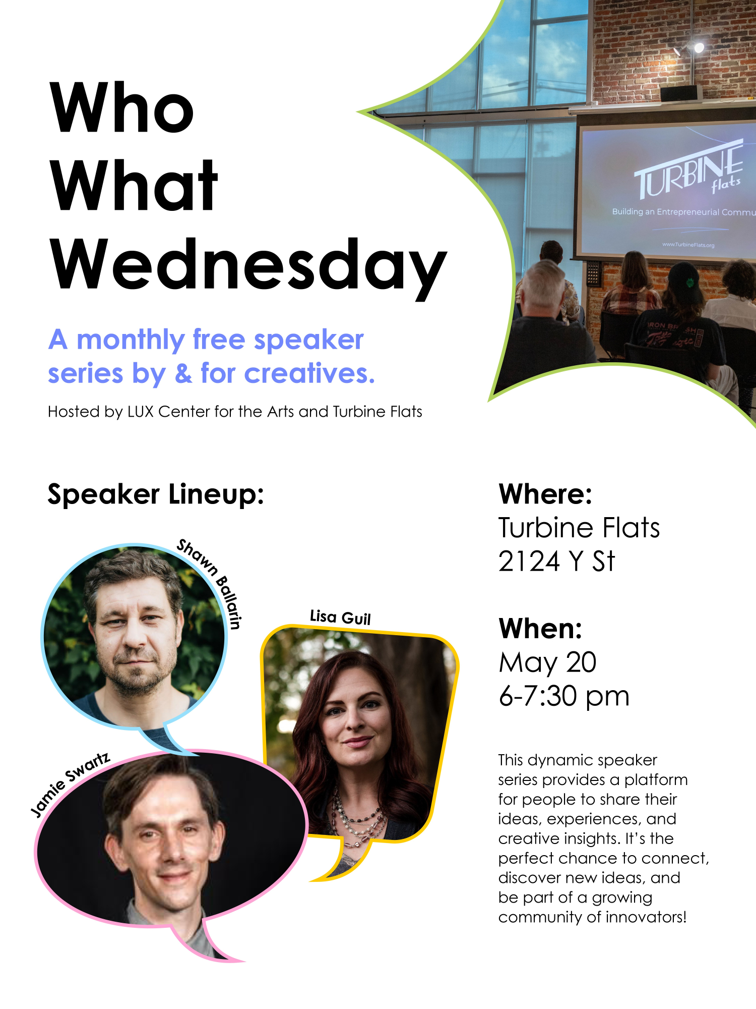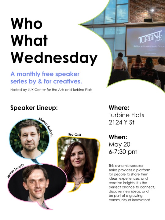 Who What Wednesday is an exciting monthly event designed to bring together diverse voices from across the Lincoln community to inspire, connect, and create. Hosted by The LUX Center for the Arts and Turbine Flats, this dynamic speaker series provides a platform for artists, entrepreneurs, musicians, performers, and writers to share their ideas, experiences, and creative insights.
