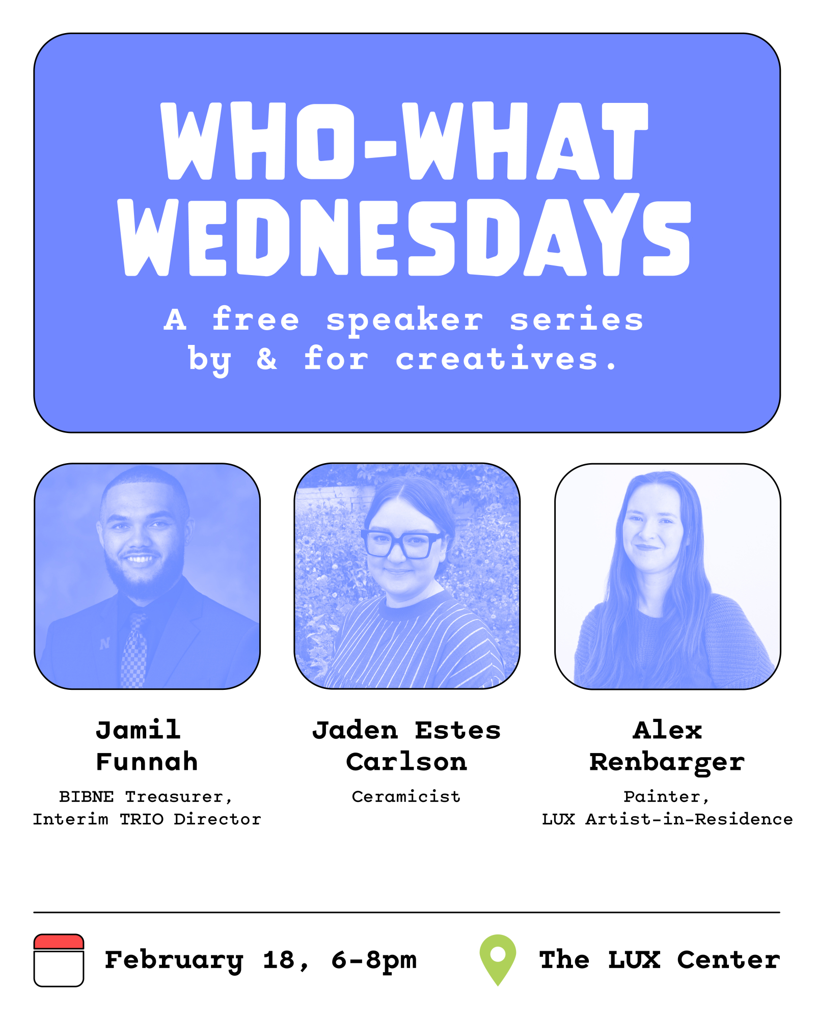 Join us at the LUX on Wednesday, Feb 18 from 6-8 pm for Who What Wednesday – a monthly free speaker series bringing together fellow creatives from across the Lincoln community.