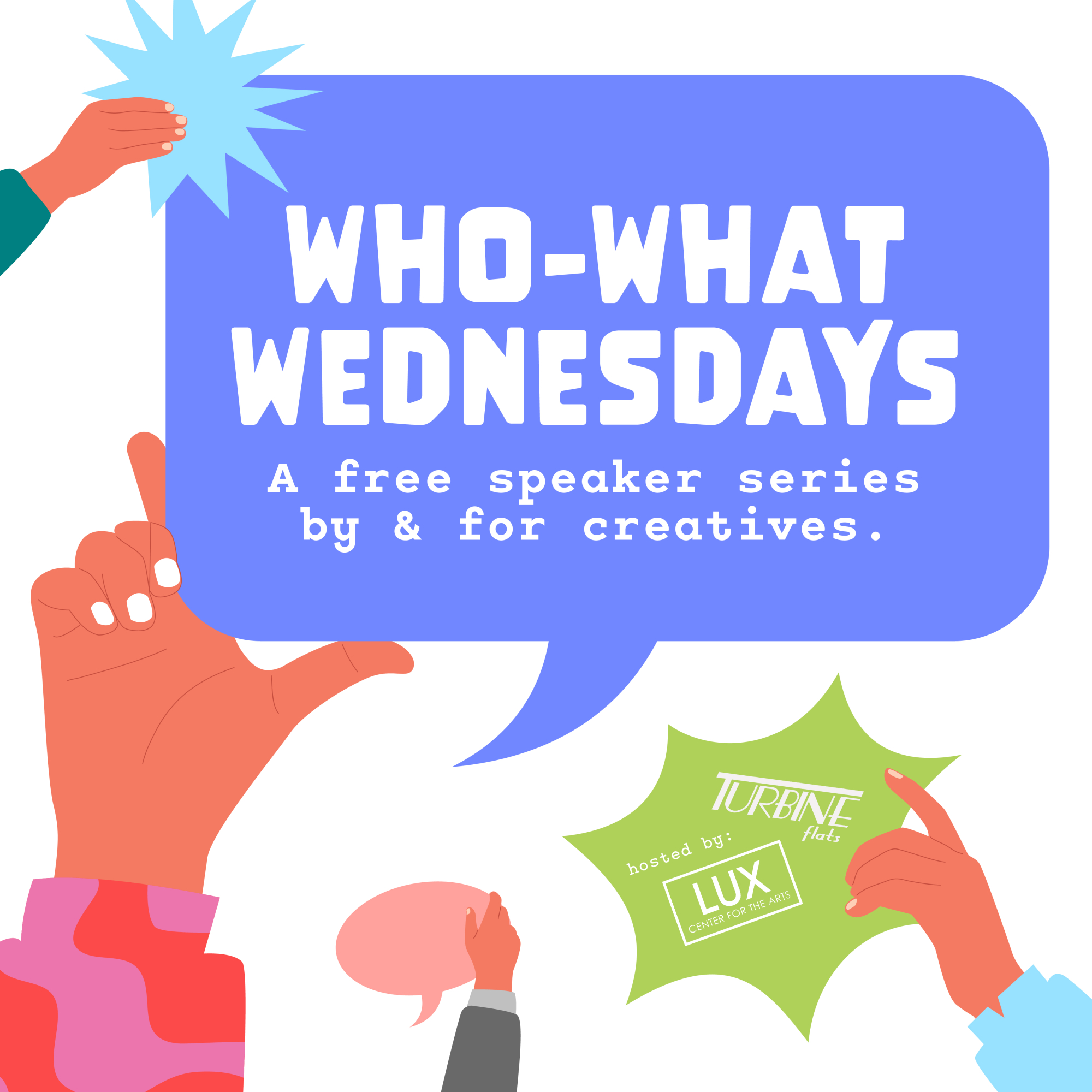 Who What Wednesdays is an exciting monthly event designed to bring together diverse voices from across the Lincoln community to inspire, connect, and create. Hosted by The LUX Center for the Arts and Turbine Flats, this dynamic speaker series provides a platform for artists, entrepreneurs, musicians, performers, and writers to share their ideas, experiences, and creative insights.