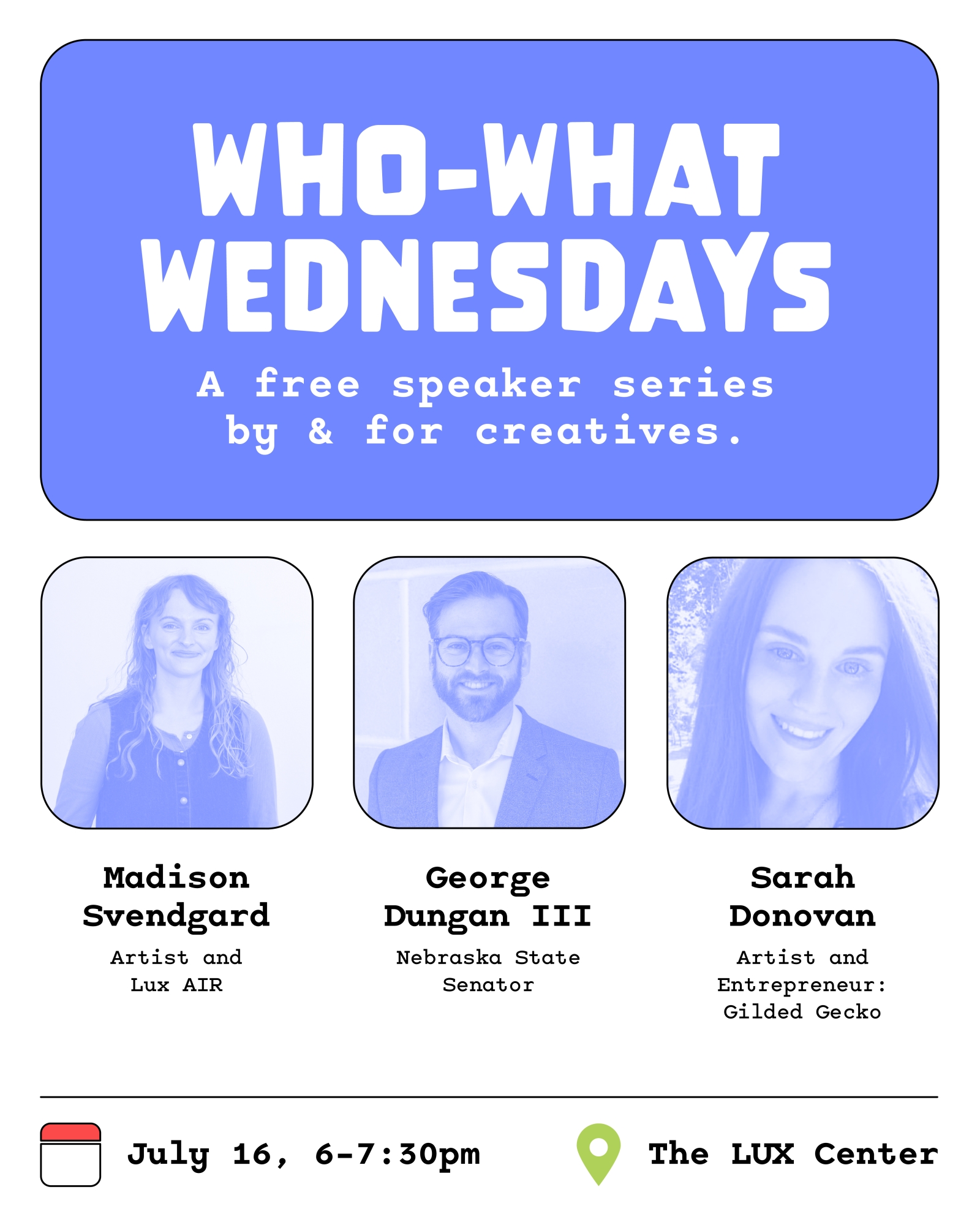 Who What Wednesdays is an exciting monthly event designed to bring together diverse voices from across the Lincoln community to inspire, connect, and create. Hosted by The LUX Center for the Arts and Turbine Flats, this dynamic speaker series provides a platform for artists, entrepreneurs, musicians, performers, and writers to share their ideas, experiences, and creative insights.