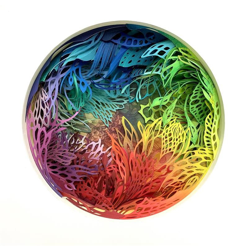My creative process combines a mindset of play with formation. Often my work reflects highly repetitive actions - drawing, cutting, gluing, shaping. This repetition is a form of meditation, and the significant time those repetitive, meditative acts take is an important investment - a way to affirm to myself and to the viewer that an idea matters and has value. I work intuitively, experimenting with drawings or materials until I find a composition or form that excites me and causes me to investigate further. My investigations often lead to the creation of amalgams, invented ecosystems that can reflect aspects of both the ocean and the forest floor. Repetitive elements like leaves, cells, fungi, flowers, feathers, coral and scales are soothing, both to observe and to duplicate, and it is in these types of forms that I most easily see evidence of order. Nature is bizarre yet familiar, majestic yet whimsical, and my pieces are most successful when they demonstrate a balance of that same kind of paradoxical tension.